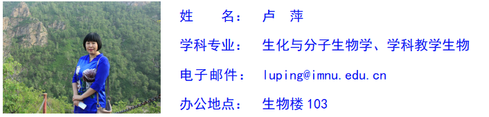卢萍,女,蒙古族,中共党员,博士,bat365官方网站教授,硕士生导师(生物化学与分子生物学、学科教学生物),蒙古国农业大学博士生导师,bat365官方网站生物化学与分子生物学硕士学位点主任、教授委员会成员、中国遗传学会教育教学专业委员会委员、澳大利亚阿德莱德大学国家公派访问学者、内蒙古遗传学会副理事长、内蒙古生物化学与分子生物学会副理事长、内蒙古细胞生物学会常务理事、内蒙古医学会生物化学与分子生物学分会副主任委员、内蒙古草原学会理事、内蒙古自治区科普专家团成员,曾多年担任生物技术系主任、教工党支部书记、学院党总支委员。研究方向为遗传学、生物化学与分子生物学、分子生态学、植物种质资源学。主持国家自然科学基金项目3项、省部级科研项目4项、厅级项目1项,参加国家级和省部级科研项目10余项。发表SCI、CSCD及北大核心期刊论文80余篇,出版学术专著2部、国家级教材1部,获得bat365官方网站科研成果奖和教学成果奖4项,被学校授予“优秀科研工作者”、“优秀研究生导师”、“爱岗敬业女职工”、“优秀班主任”、“优秀共产党员”、“优秀党务工作者”、“优秀党支部书记”、“就业工作优秀导师”、“五四青年团最佳支持者”等荣誉称号,主讲本科生“遗传学”(自治区精品课)、“基因工程”(校级精品课)、“分子生物学”、“生物学专业英语”、“专业实习”、“教学技能训练”,研究生“生物化学与分子生物学”、“基因工程学”、“生物学专业英语”、“现代生物技术”、“基因表达与调控”、“基因组学”等课程。