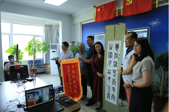 苏德那木校友代表74级同学向学院敬献锦旗,王伟东校友向学院敬献墨宝,表达了对学院七十年华诞的美好祝福。