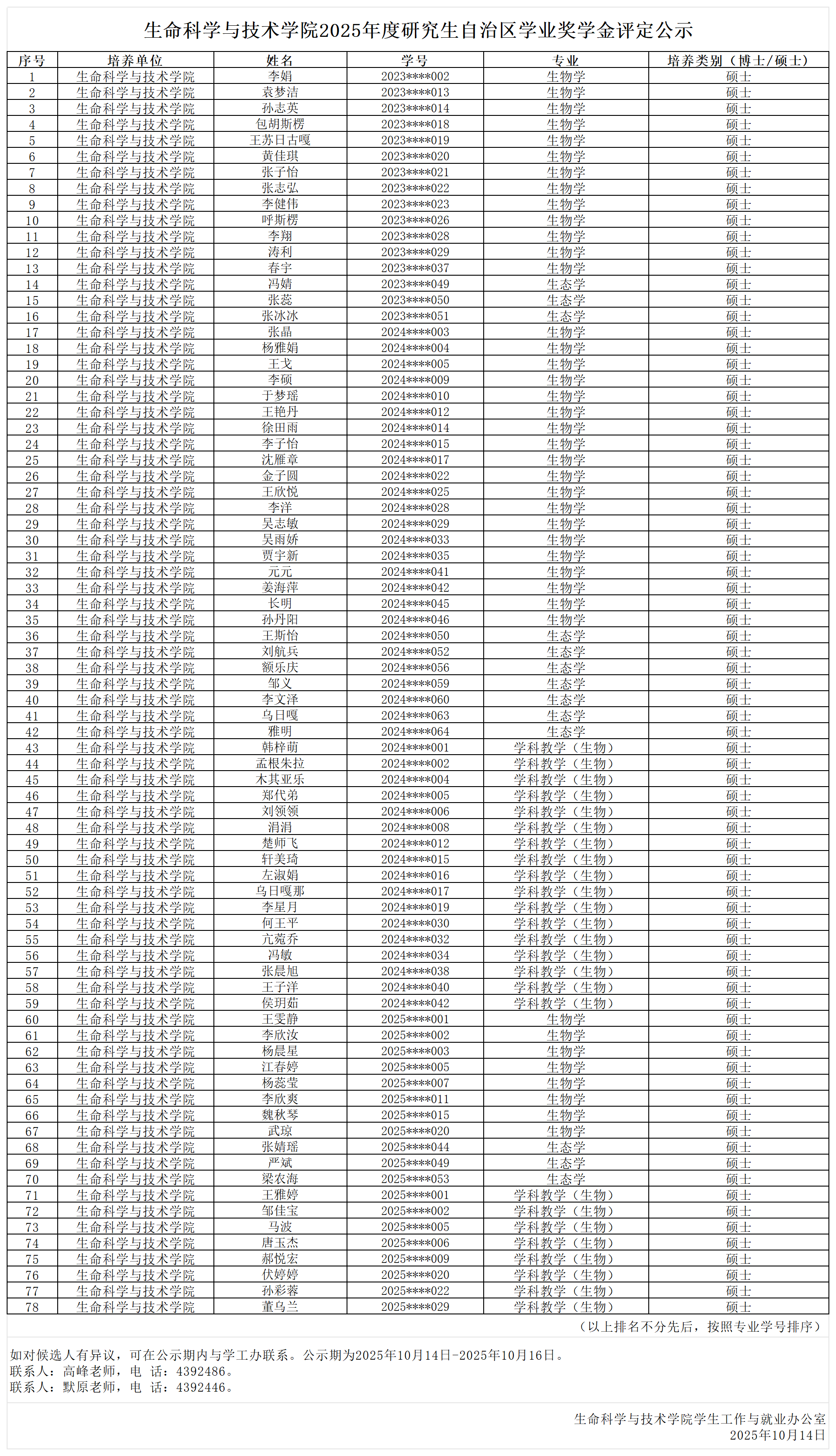 bat365官方网站2025年度研究生自治区学业奖学金评定公示